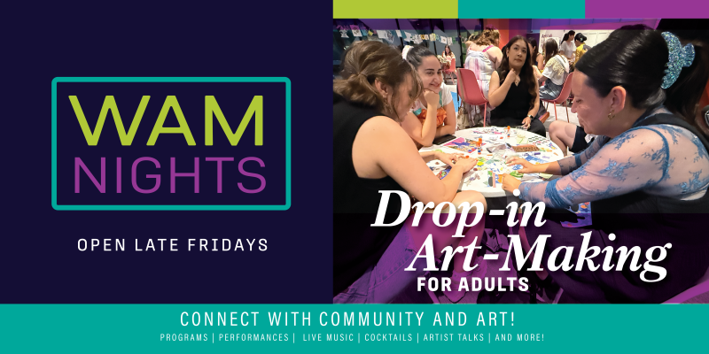 About WAM Nights: We’re open late on Fridays until 9 pm! Get your weekend started with after-hours access to the galleries and shopping in the Museum Store. WAM Nights will include programs with artists, musicians, and performers–don’t miss your chance to see the art at WAM in a new way! The museum comes to life with local creatives during WAM Nights! WAM Nights will include programs with artists, musicians, and performers–don’t miss your chance to see the art at WAM in a new way!