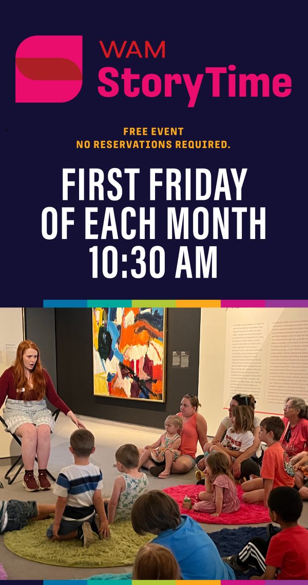 Join us for engaging stories and related activities that make works of art come to life for young learners and their caregivers during StoryTime in the galleries on the first Friday of each month. Each program weaves together a children’s book, focused art looking at an artwork or exhibition, and a featured guest who brings energy through performance, music, movement, and creative play. Extend your visit by exploring PLAY—WAM’s interactive space for families—afterward.