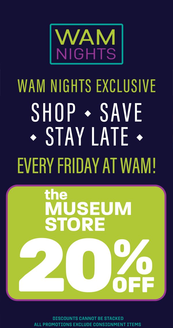 About WAM Nights: We’re open late on Fridays until 9 pm. Start your weekend with after-hours access to the galleries, shopping in the Museum Store, and a stop at EAT for flatbreads, salads, coffee, and specialty drinks. WAM Nights feature programs with artists, musicians, and performers, offering a dynamic way to experience the museum. The building comes to life with local creatives during WAM Nights.