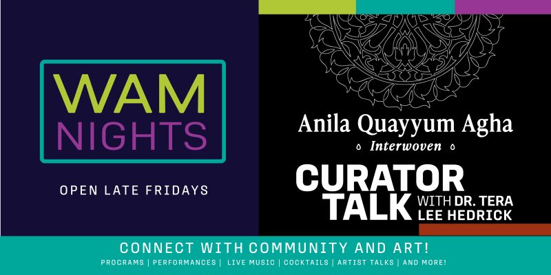What is the Alhambra? Who is Robert Irwin? Join WAM’s curator Dr. Tera Lee Hedrick for art historical insight into references in the featured exhibition Anila Quayyum Agha: Interwoven. This light and lively talk will be engaging for art history novices and aficionados alike.