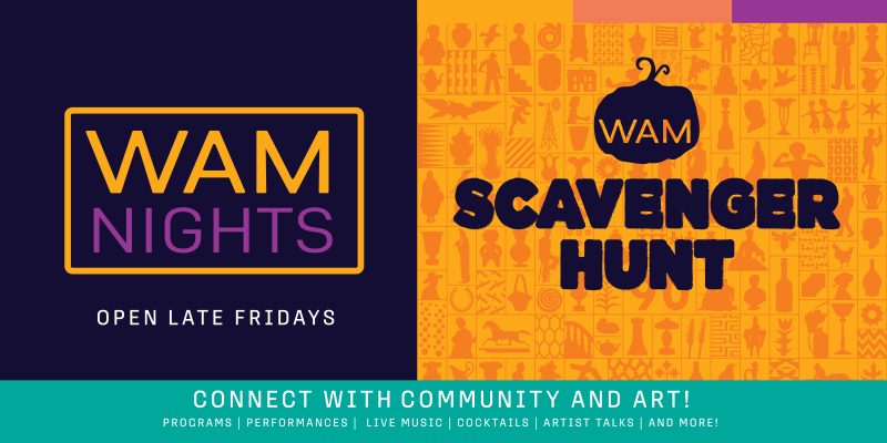About WAM Nights: We’re open late on Fridays until 9 pm! Get your weekend started with after-hours access to the galleries and shopping in the Museum Store. WAM Nights will include programs with artists, musicians, and performers–don’t miss your chance to see the art at WAM in a new way! The museum comes to life with local creatives during WAM Nights! WAM Nights will include programs with artists, musicians, and performers–don’t miss your chance to see the art at WAM in a new way!
