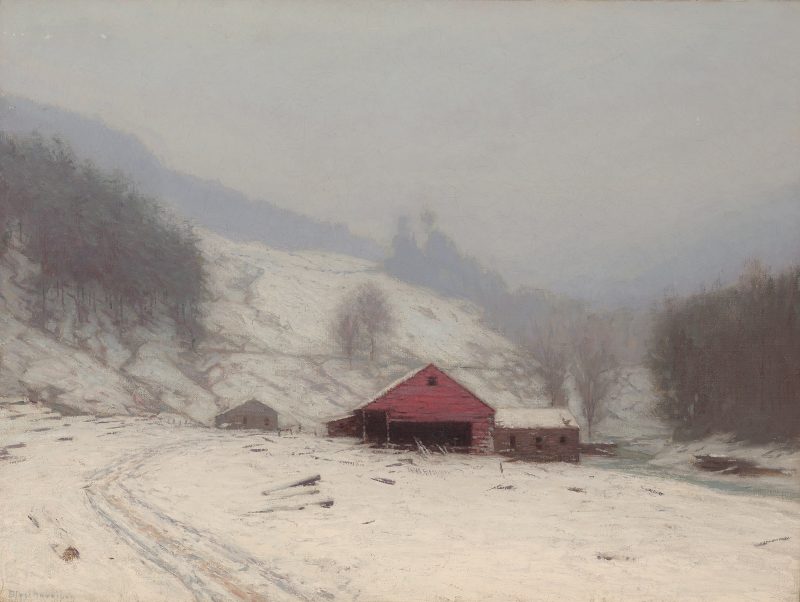 One of the most sophisticated groups of landscapists working at the end of the 19th century represented a movement that flourished between 1880 and about 1915 which today is known as Tonalism. Birge Harrison was certainly one of the leading spokesmen of this movement and this work painted by Harrison about 1910 and titled Old Sawmill rather clearly epitomizes Tonalist aesthetic theory. Here an old sawmill stands in an open expanse of snow-covered ground near the foot of a hill. Wheel tracks in the snow, as seen at the lower left, carry the eye to the middle distance. But actually the subject of this work is not so much the sawmill as it is the experience of the quiet setting itself on a cold and gloomy winter day at dusk when the misty atmosphere suppresses all detail and like a diaphanous veil faintly blurs the bushes and trees and the outline of the distant hill. Human figures are altogether absent from the composition, and it is the magic of the broad view into open natural space which evokes a mood of complete quiet, tranquility and solitude, a mood much intensified by the dominant subdued gray and blue-gray color tones, extremely close in value much as in a black and white photograph. What is especially interesting is that the same tonal proximity that contributes to the mood of this painting also occurs in nature at early dawn, at dusk and at moonlight and during the late fall and winter seasons, a fact which explains the time-setting most often chosen by the Tonalist. Indeed, all the characteristics of this painting typify the aesthetic doctrine to which the Tonalist group rather uniformly adhered.